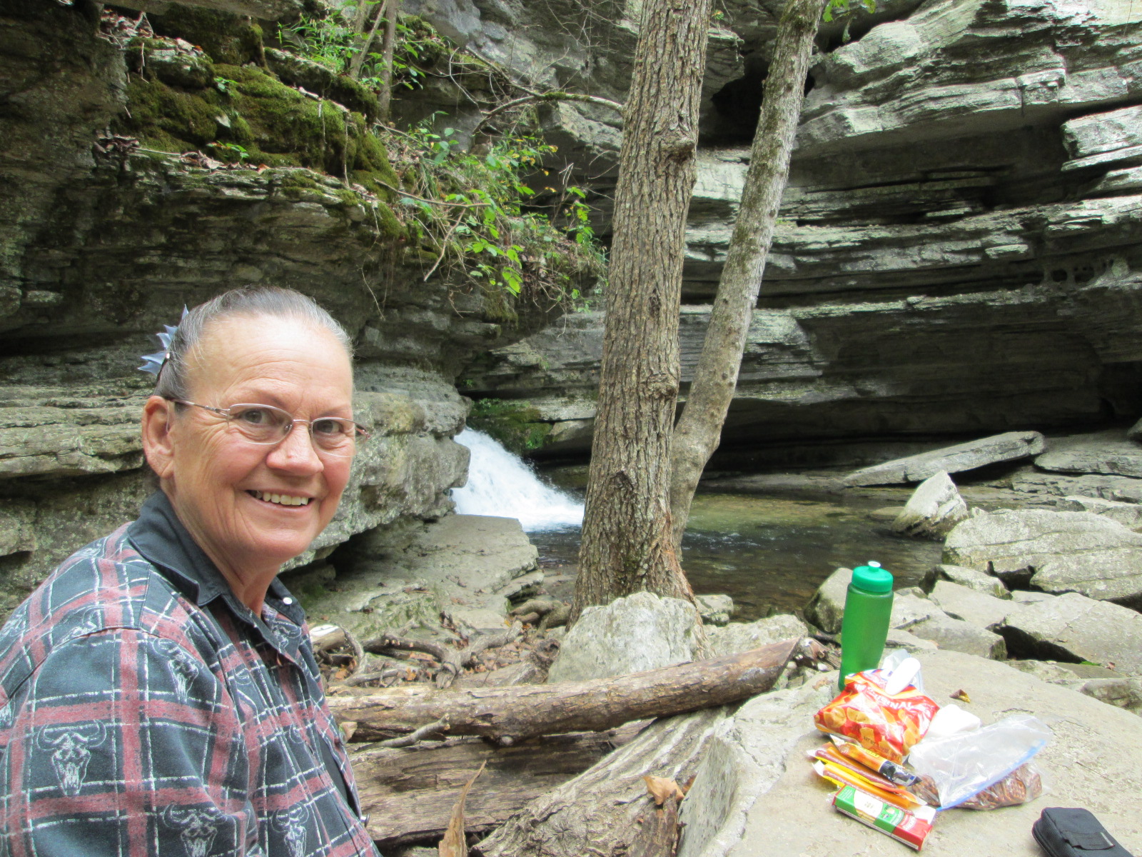 We skipped the Caverns and opted instead to visit Blanchard Springs.  Rainwater falling on the Ozarks has soaked into the ground for millions of years.  As it moved thru cracks in the limestone bedrock, it dissolved the stone and slowly widened the cracks to form Blanchard Springs Caverns.  The water remained in the caverns until surface erosion carved valleys and allowed the water to escape.  We are in such a valley now.  As this valley cut deeper and deeper, lower sections of the cave were drained.  New springs then developed below older dried-up springs.  Blanchard Springs probably came out of the holes high on the bluff above us many years ago, when the streambed lay 20-30 feet above it's present level.
