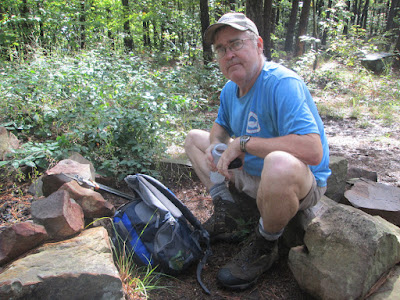 After we finished maintaining our 2+ mile section of the Ouachita Trail, just for fun we drove up to the Talimena Scenic Drive and over to the Winding Stair Mountain Trailhead where we left our car and walked the mile up to the top of Winding Stair Mtn. where Tom placed a rock onto the massive rock cairn.